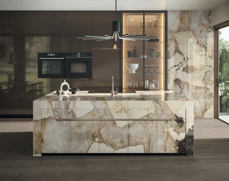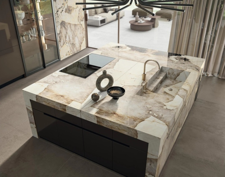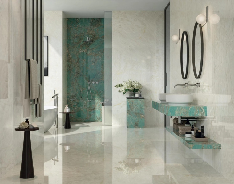 Površina inspirirana tirkiznom bojom brazilskog kvarcita, u liniji Amazzonite ima kontrastne vene koje se izmjenjuju s kristalnim inkluzijama koje podsjećaju na dubine tropskog morskog dna.